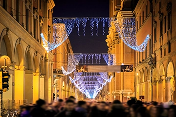 Die gesamte Stadt erstrahlt in einem Meer von Lichtern. Von den mittelalterlichen Säulengängen und Palästen bis hin zu den Straßen, Plätzen und Türmen Garisenda und Asinelli – überall funkeln Lichter und festliche Dekorationen. Ein Highlight ist der große Weihnachtsbaum, der im historischen Zentrum neben der Basilika San Petronio, dem Schutzpatron von Bologna, steht.