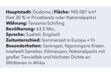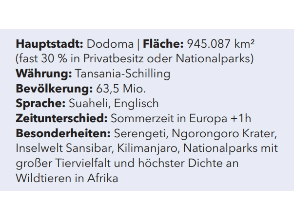 TANSANIA – ein Land in Ostafrika, das seine Besucherinnen von der ersten Minute an in seinen Bann zieht. Ob es an der beeindruckenden Landschaft mit dem höchsten Berg Afrikas, den endlosen Grassavannen der Serengeti, der beeindruckenden Vulkanlandschaft wie dem Ngorongoro Krater oder der vielfältigen Tierwelt liegt? Oder ist es die freundlich und lebensfrohe Bevölkerung, die trotz unterschiedlicher Herkunft und Religion in einer friedlichen Gemeinschaft lebt? Das kann jeder Gast während seines Aufenthalts selbst entscheiden.