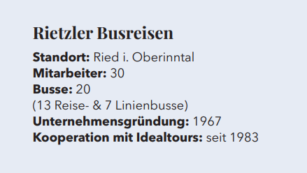 „Mein Papa und Gründer von Rietzler Reisen hat im Jahre 1967 mit einem achtsitzigen Kleinbus erstmals Personentransporte durchgeführt, 1979 wurde dann der erste Reisebus, ein 30-Sitzer der Marke Setra, angeschafft. Seit Beginn der Kooperation mit Idealtours im Jahr 1983 ist unser Fuhrpark stetig gewachsen. Durch das recht schnelle Ableben meines Vaters habe ich 2005 kurzerhand mit 19 Jahren den Betrieb übernommen. Unsere festen Standbeine sind nun Ausflugsfahrten, Erlebnis- und Kulturreisen, Transferfahrten, Fahrradreisen bis hin zu Taxidiensten und vielem mehr.