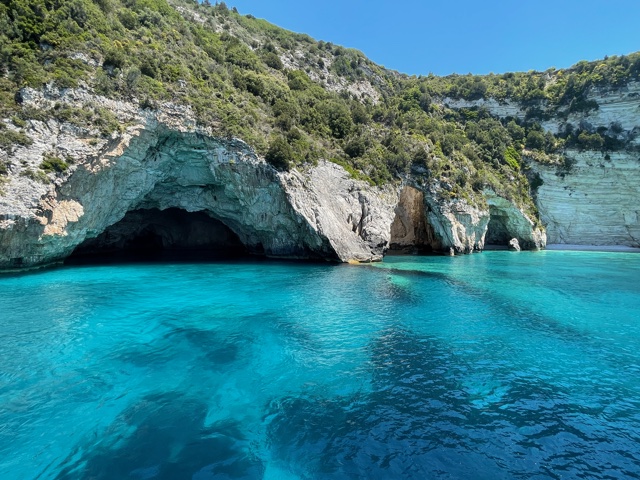 Weiter ging die Fahrt nach Paxi zu der blauen Grotte, einfach beeindruckend – auch hier unfassbar glasklares, türkises Wasser, das zum Baden einlud. Auf der Fahrt Richtung Gaios (der Hauptstadt von Paxos) schipperten wir ganz nahe der Küste entlang und stoppten kurz bei einer beeindruckenden Felsformation die an den „Arc de Triomphe“ in Paris erinnert, nur halt aus Felsen. Zum Mittagessen kehrten wir in Gaios in einer typischen griechischen Taverne mit blau-weiß karierten Tischdecken ein, umgeben von wunderschönen Olivenbäumen. Fangfrischer Fisch und ein Ouzo mussten einfach sein. Wir unternahmen einen kurzen Bummel durch den malerischen Ort, der an ein Filmset einer perfekten Romanze erinnerte. Dann ging es auch schon wieder zurück nach Parga. Ein kurzer Blick auf die Uhr verriet uns, dass der Tag wie im Flug vergangen ist, denn wir erreichten den Hafen um 18 Uhr. Ein Ausflug, der sich absolut auszahlt und den wir jedem Epiros-Urlauber empfehlen können.