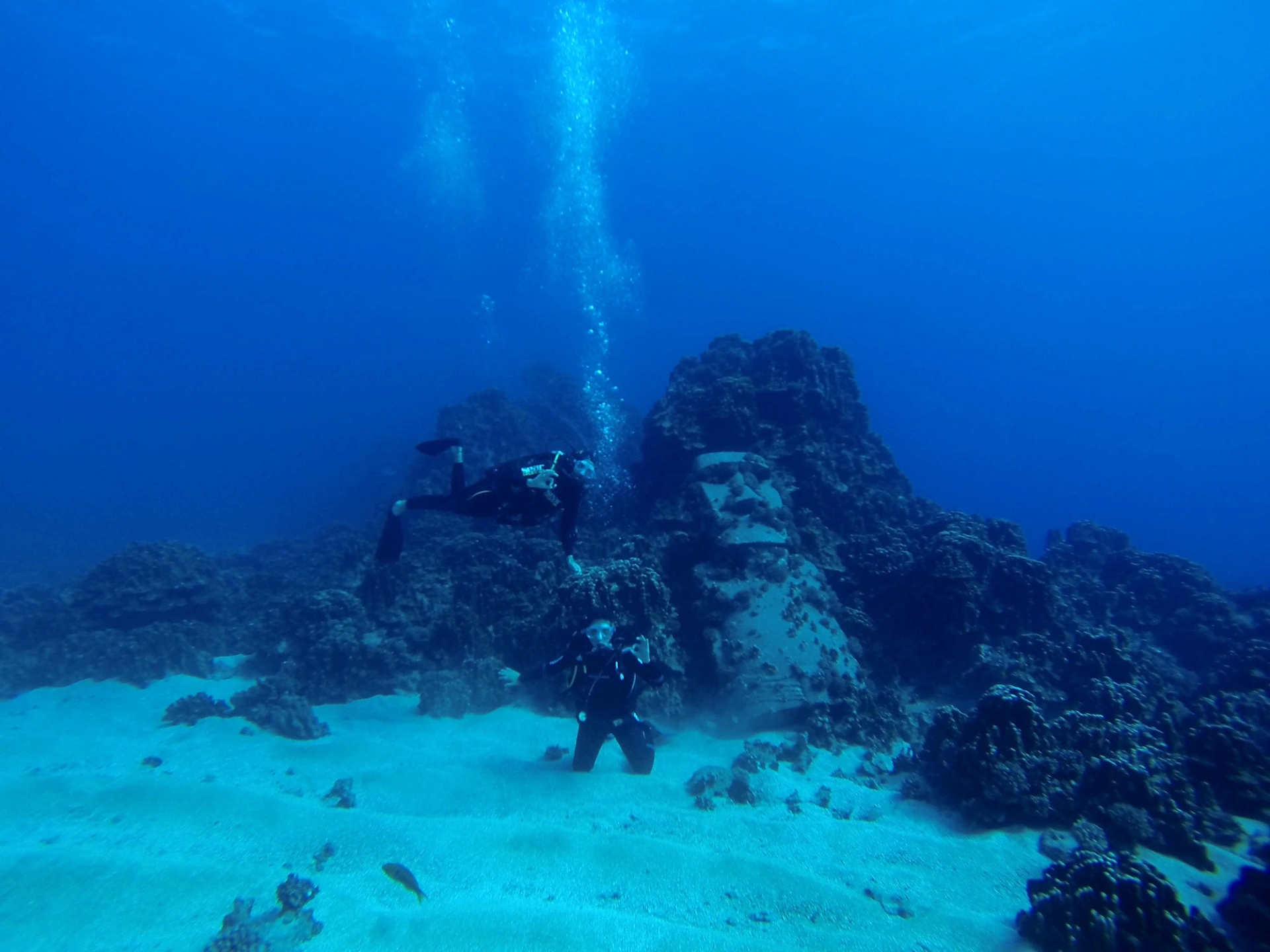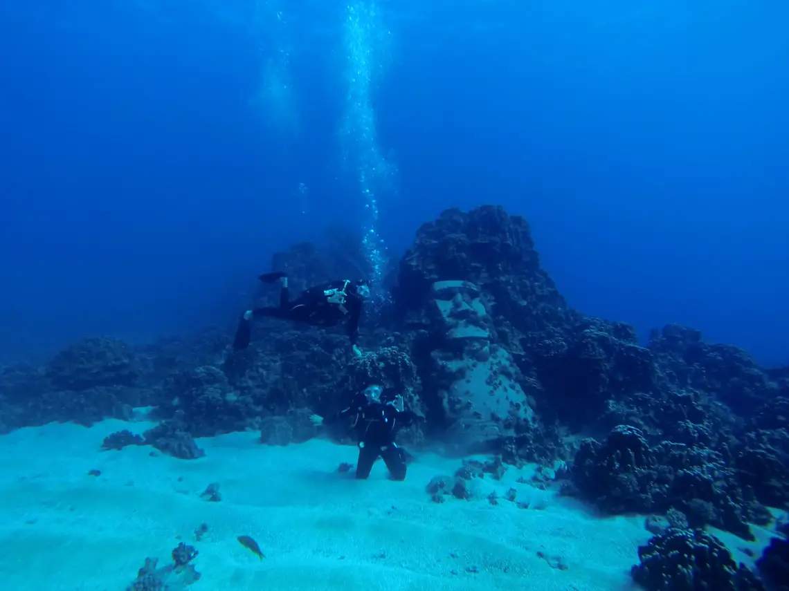 Obwohl zu der Zeit, an der wir auf der Osterinsel waren (Juni) gerade Winter ist, sind die Temperaturen herrlich. Jeder Tag brachte um die 23 Grad und Sonnenschein. Nur das Meer war teilweise so wild, dass wir unseren geplanten Tauchgang mehrmals verschieben mussten. Als es dann geklappt hat und der Pier offen war, tauchten wir zu einem Unterwasser-Moai, welcher zu Filmzwecken hier versenkt wurde. Als Tauchspot macht er sich natürlich sehr gut ;)