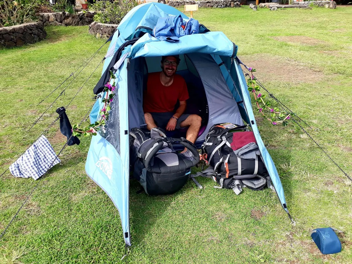 Von der Osterinsel wussten wir bis dato nur, dass es die Insel ist, die am weitesten von jeglichem Festland entfernt ist und, dass auf genau dieser Insel die geheimnissvollen Statuen stehen, deren Geschichten und Vermutungen tausende Varianten hat. Und noch eines wurde uns im Vorhinein gesagt: es gäbe dort keinen einzigen Baum. Das wiederum mussten wir gleich in Frage stellen, als wir mit der chilenischen Airline Latam nach ca. 5 Stunden Flug von Chile aus auf der kleinen Insel mitten im Pazifik landeten und unglaublich viele Bäume sahen. Als Unterkunft wählten wir einen Campingplatz in der Nähe des Hauptortes "Hanga Roa", der uns für die kommenden 9 Tage ein kleines gemütliches Zelt zur Verfügung stellte.