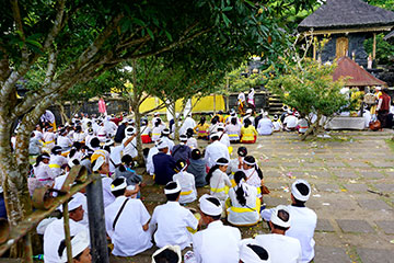 In einer Sackgasse angekommen, kam uns ein Eis schleckender 10-Jähriger entgegen und bat uns an neben seinem Haus zu parken. Ohne einen „Sarong-Rock“ darf man den Tempel nicht betreten, deshalb lieh er uns auch die Röcke seiner Mutter und Oma. In Eis-Mathematik rechnete er sich aus, wieviel Geld er nun von uns verlangen könnte. Mit Freude und in seinen Augen viel Geld rannte er lachend zu seinem Freund.