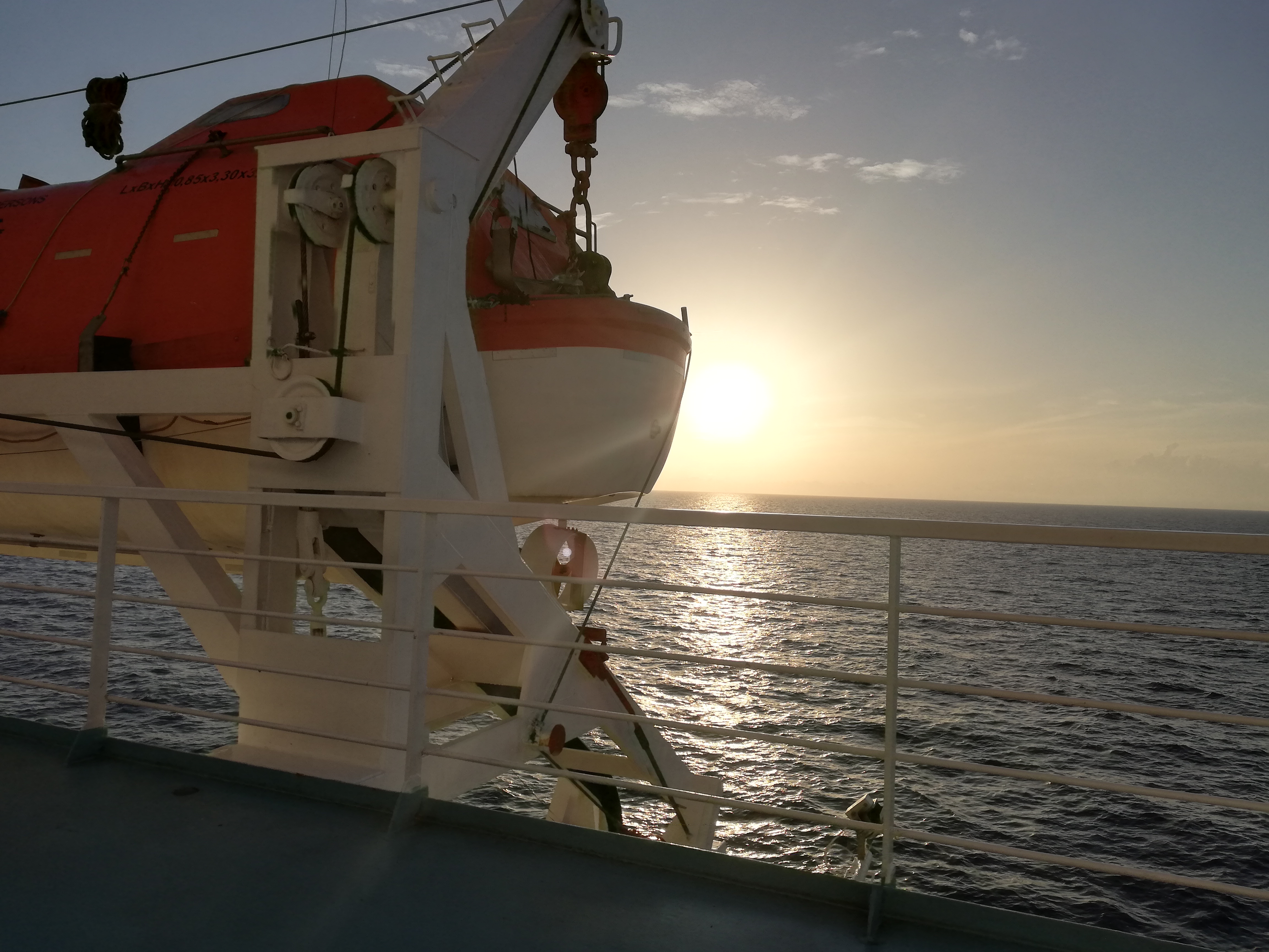 Unsere Fähre retour startet wieder von Golfo Aranci, einem Dorf bei Olbia und so machen wir uns nach dem Frühstück auf Richtung Fährhafen. Mit einem Stopp bei einem großen „supermercato“, um noch italienische Köstlichkeiten einzukaufen und ein wenig Urlaub mit nach Hause zu nehmen, erreichen wir am frühen Nachmittag unseren Ausgangsort. Wider Erwarten ist der Strand auch direkt neben der Anlegestelle der Fähre ein wahrer Traumstrand mit türkisblauem Wasser. Ein letztes Mal entspannen wir im weißen Sand (die Liegen sind Ende September nun bereits alle weg geräumt und die Strandbars größtenteils geschlossen) und plantschen im glasklaren Wasser, bevor wir am Abend aufs Schiff fahren. An Deck schauen wir uns den Sonnenuntergang an, während wir ablegen und die Insel immer kleiner wird … In unserer Kabine machen wir es uns gemütlich und erwachen um halb sechs vom Weckruf des Kapitäns. Die Müdigkeit verschwindet schnell, die Aufregung vom Ausparken steigt und gegen sieben fahren wir am Hafen von Livorno aus dem Schiffsbauch und dem Sonnenaufgang entgegen Richtung Heimat.