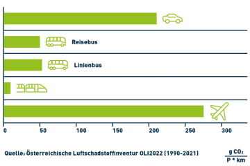 Busreisen stellen im Vergleich zu anderen Transportmitteln eine umweltfreundliche Alternative dar. Mit einem CO2-Ausstoß pro Passagier von nur ca. 49,5 g/pkm übertrumpfen sie deutlich Autos und Flugzeuge. Quelle: Österreichische Luftschadstoffinventur OLI2022 (1990-2021)