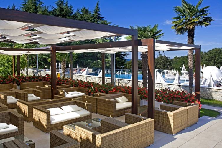 in der ruhigen Feriensiedlung „Plava Laguna“; Porec ist zu Fuß in ca. 20 min. oder mit dem Bummelzug (Haltestelle direkt vor dem Hotel) erreichbar.