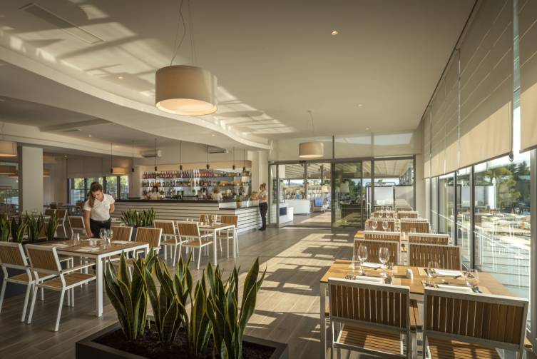 Frühstück, Halbpension plus: umfangreiches Frühstücks- und Abendbuffet (auch auf Terrasse), thematische Buffetstationen, zum Abendessen alkoholfreie Getränke vom Dispenser inklusive, Show-Cooking, à-la-carte Restaurant „Oliva Grill“ am Pool, Snack Bar am Strand.