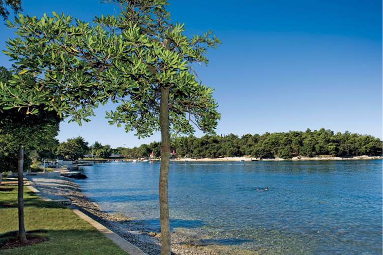 direkt am Meer, in der Feriensiedlung Zelena Laguna; Strand mit der blauen Flagge ausgezeichnet: Fels-, Kies-, Rasen- und Pflasterstrand; Liegestühle und Sonnenschirme gegen Gebühr.
