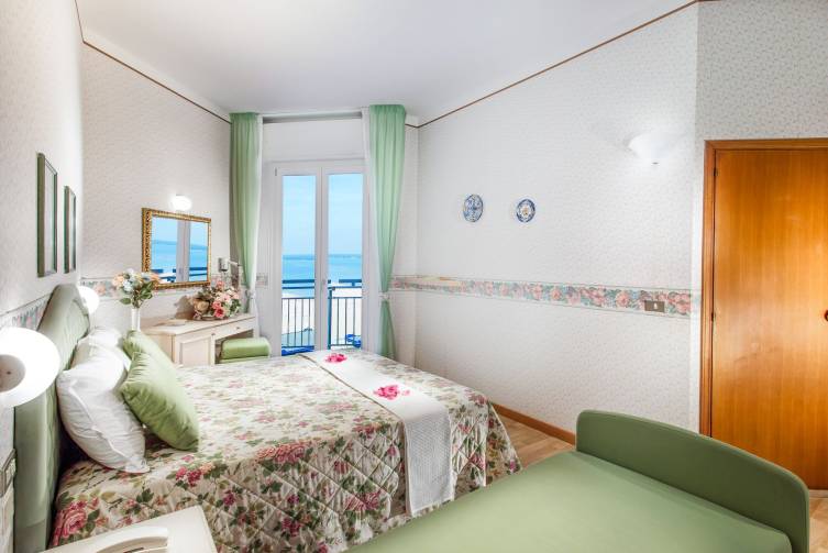 Familienzimmer auf Anfrage buchbar; mit Doppelbett und Verbindungstür zu Zimmer mit Einzelbetten, direkter Meerblick;