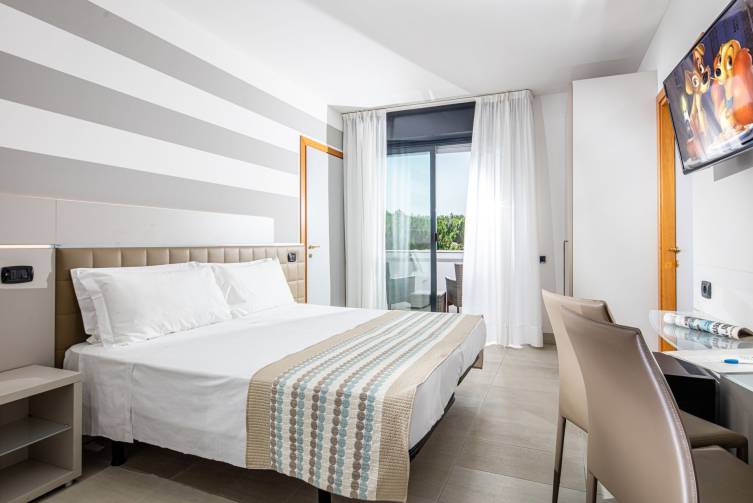 Doppelzimmer Superior mit Etagenbetten (4 Personen), Balkon mit Tisch und Stühle, Badezimmer mit Duschkabine, WC, Föhn, Telefon, Sat-TV, Safe, Minibar, Klimaanlage, ca. 14 m²;