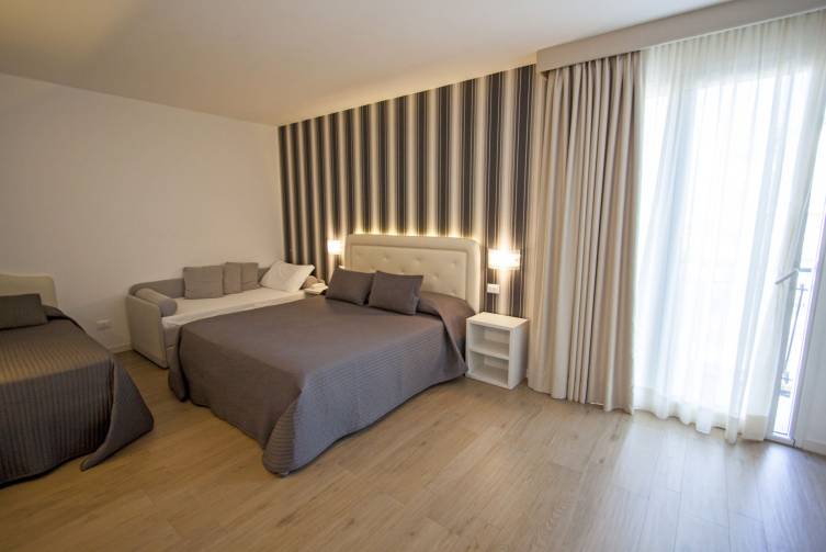 50; alle komfortabel eingerichtet, mit Klimaanlage; Doppelzimmer mit Dusche/WC, Föhn, Telefon, Sat-TV, Safe, Balkon oder französischem Balkon, ca. 11 m²; Dreibettzimmer mit Zustellbett, ca. 15 m²; Vierbettzimmer mit Stockbetten; Doppelzimmer Standard Plus mit Balkon und Poolblick, ca. 13 m²; Dreibettzimmer Standard Plus mit Zustellbett, Balkon und Poolblick, ca. 16 m²; Vierbettzimmer Standard Plus mit Stockbett, Balkon und Poolblick, ca. 17 m²; Einzelzimmer mit franz. Balkon, ca. 9 m²; Kinder im Hotel bis 0,9 Jahre € 20,-/Nacht (zahlbar vor Ort).