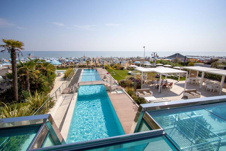 Das topmoderne 4-Sterne-Hotel besticht durch luxuriöses Ambiente, direkte Strandlage und ausgezeichneten Service. Der exklusive Spa-Bereich im obersten Stockwerk bietet einen atemberaubenden Meerblick. Mit mehreren Pools und direktem Zugang zum Strand ist es der perfekte Ort für Erholung und Shoppinggenuss in der Fußgängerzone Jesolos.