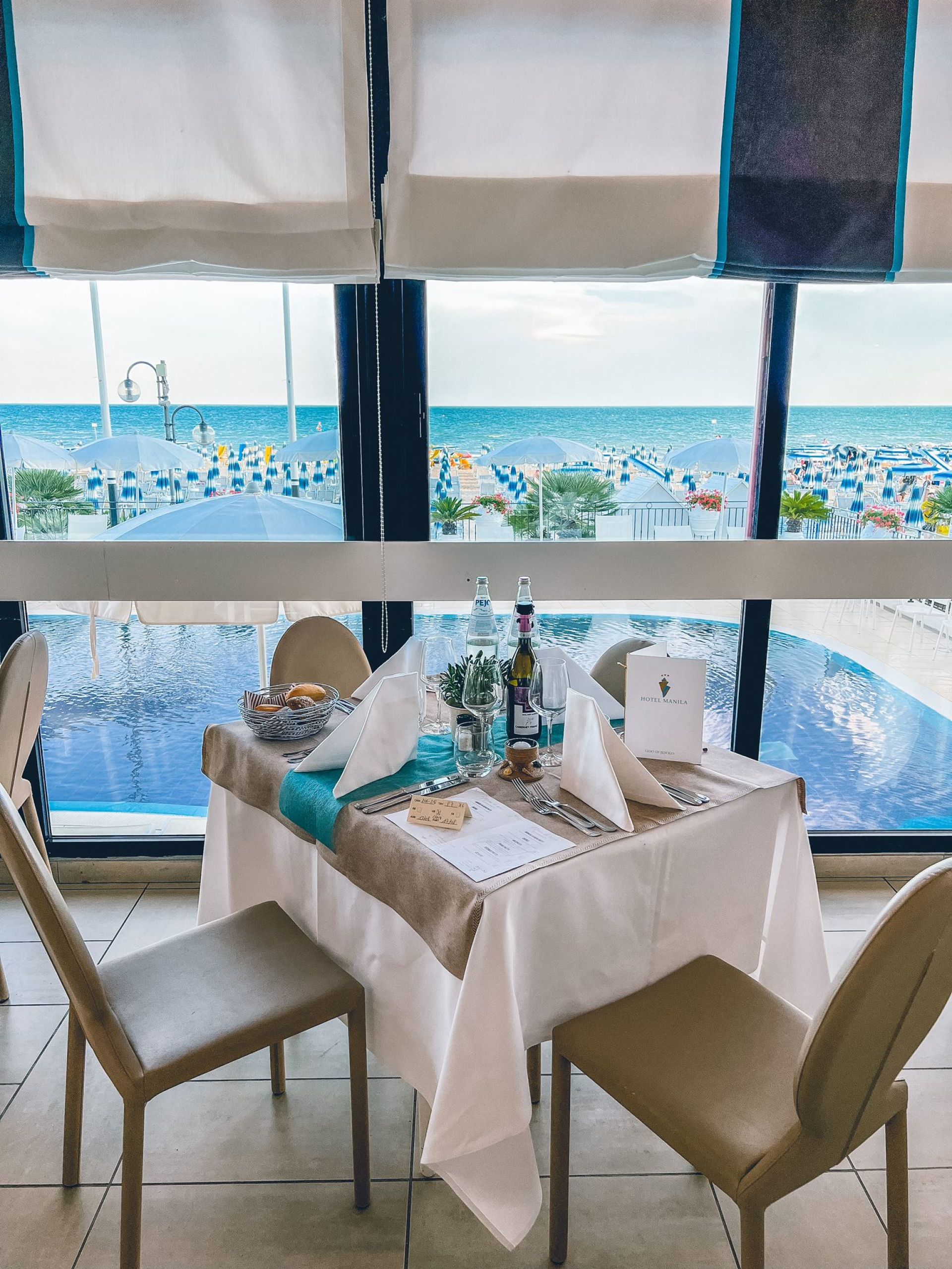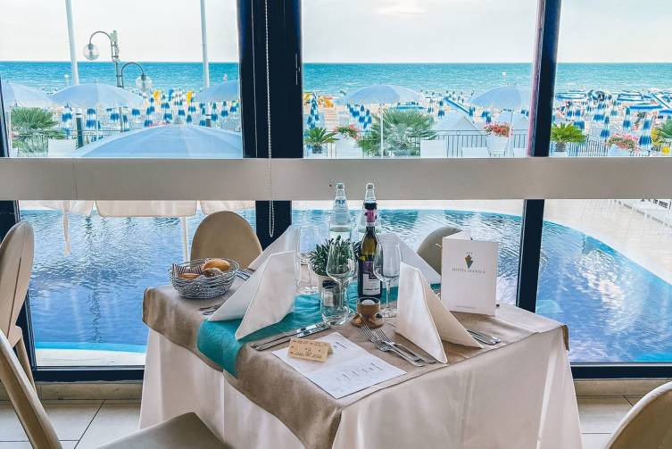 Frühstück, Halbpension, Vollpension: reichhaltiges Frühstücksbuffet, mittags und abends Wahlmenü mit Salat- und Gemüsebuffet, italienische und internationale Küche, Speisesaal mit Blick aufs Meer.
