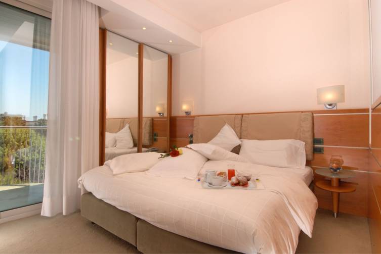 Doppelzimmer Classic mit Dusche/WC, Telefon, Safe, Föhn, Sat-TV, Klimaanlage, Minibar, mit Poolblick oder Blick zur Palmenterrasse, mit Balkon, ca. 14,5 m², Zusatzbett für Kinder bis max. 11,9 Jahre;
