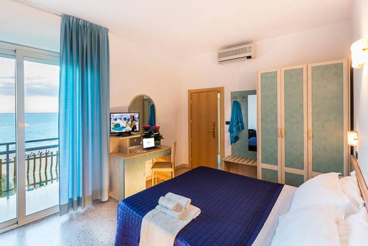 direkt am Strand (nur durch Uferstraße getrennt), Sonnenschirm und 2 Liegen pro Zimmer inklusive.