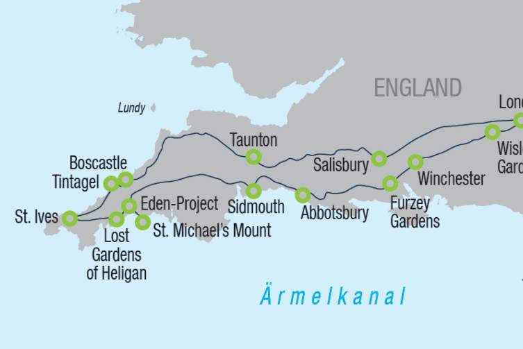 Weit schöner als in den berühmten Pilcher-Filmen präsentiert sich Ihnen auf unserer bezaubernden Frühlingsreise zur Rhododendron-Blütezeit die blütenübersäte Küstenlandschaft im Südwesten der britischen Insel. Sie erleben einige der attraktivsten Küstenabschnitte, pittoreske, winzige Fischerdörfchen, berühmte Kathedralen und prachtvolle Herrensitze, das Naturwunder der Bluebells und zauberhafte Gartenanlagen mit einer überwältigenden Blütenpracht.