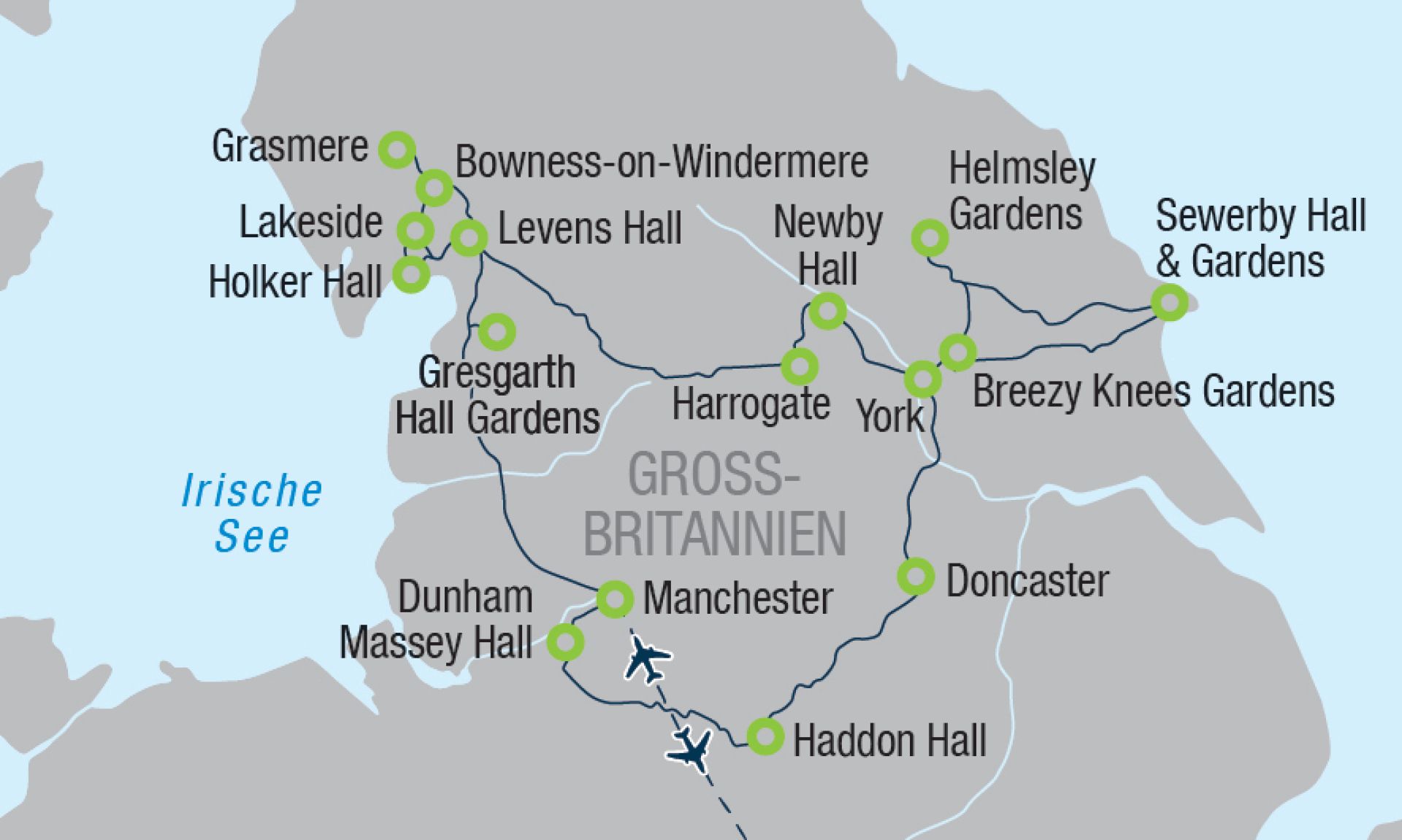 Am Morgen fahren Sie zur Besichtigung von Brodsworth Hall & Gardens bei Doncaster, einem durch British Heritage sorgsam gepflegten viktorianischen Ansitz mit stilgerechter Gartenanlage - im Anschluss durchqueren Sie den landschaftlich reizvollen Peak District und besuchen den einzigartigen, auf das Mittelalter zurückreichenden und oft verfilmten Ansitz von Haddon Hall, umrahmt von wunderbaren Gärten - ganz in der Nähe Ihres Hotels in Rochdale besuchen Sie noch die, zu einer Gärtnerei gehörenden, kleinen aber feinen, Bluebells Cottage Gardens.