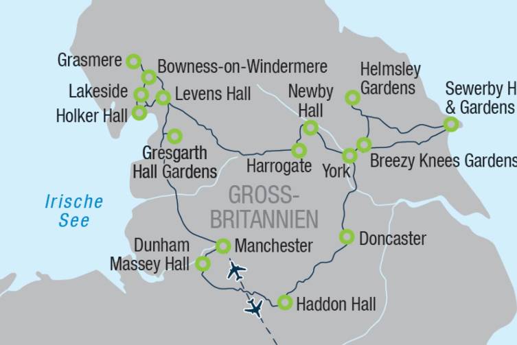 Anreise nach Manchester - auf der Fahrt in den Lake District besuchen Sie die herrlichen Gresgarth Hall Gardens, ein privates Gartenjuwel - dann geht es weiter zum malerischen Lake Windermere, dem größten See Englands - auf einer Fahrt entlang des Sees mit mehreren Fotostopps lernen Sie Ambleside, das verzauberte Grasmere und das lebhafte Bowness on Windermere kennen - rechtzeitig zum Abendessen erreichen Sie Ihr, in Newby Bridge am Südende des Sees gelegenes, Hotel in dem Sie zweimal übernachten.
