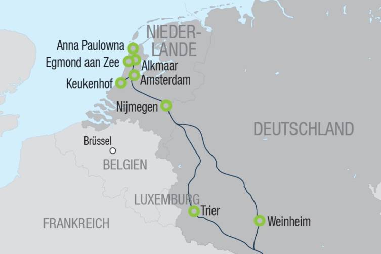 Heute geht es zunächst in das unter Denkmalschutz stehenden Dörfchen Zaanse Schans: mit seinen malerischen Häusern aus dem 17. und 18. Jhdt. und den vielen Windmühlen finden Sie sich in einem Fotoparadies wieder - danach reisen Sie in die Region Limburg und besichtigen den bezaubernden Frühlingsgarten der Familie Gubbels - Weiterfahrt nach Trier, Zimmerbezug und Zeit zur freien Verfügung.