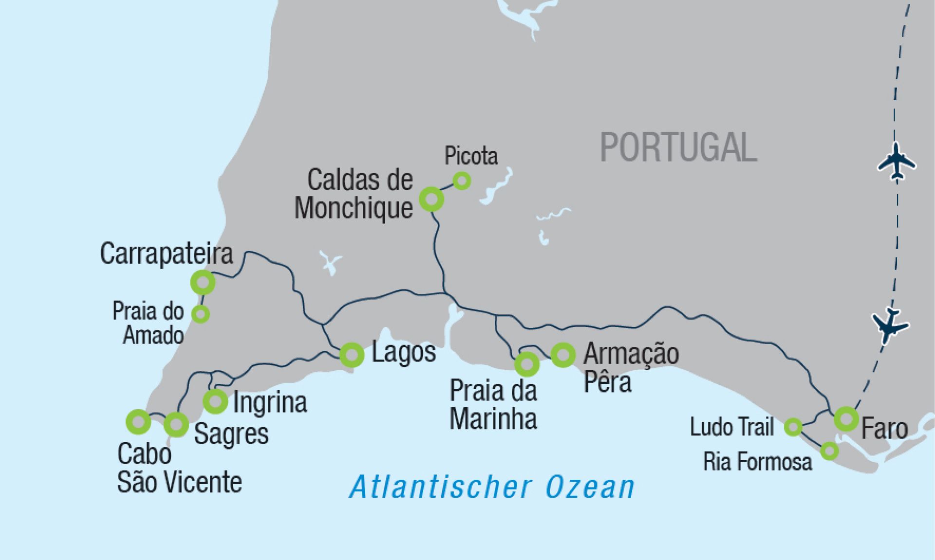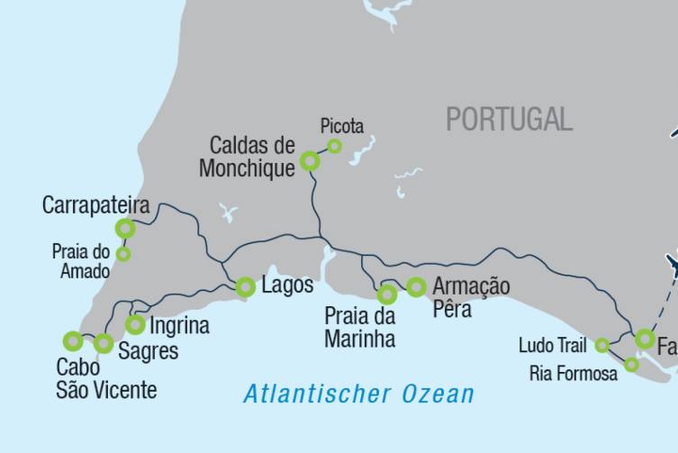 Diese Wanderung führt entlang der südwestlichen Steilküste - eine der ursprünglichsten Regionen der Algarve - auf einsamen Pfaden, durch wilde Landschaften, vorbei an goldenen Sandbuchten - nach einem Abstecher zum Cabo São Vicente, dem „Ende Europas“, bleibt Zeit für einen Bummel und individuelles Mittagessen in Sagres, wo einst Heinrich der Seefahrer seine Schule gründete - auf dem Rückweg ins Hotel besuchen Sie Lagos, das im Zeitalter der portugiesischen Entdeckungen eine bedeutende Rolle spielte.