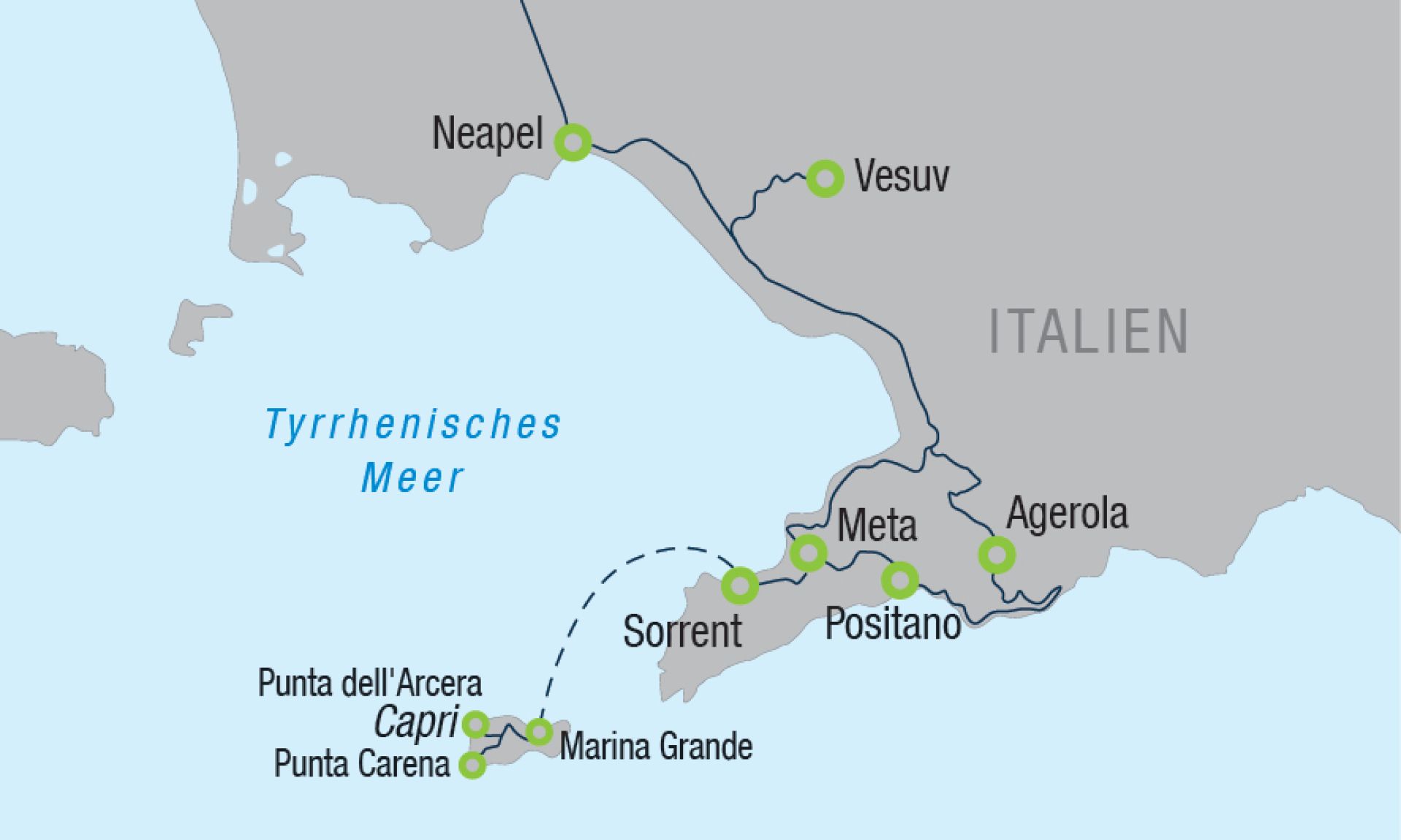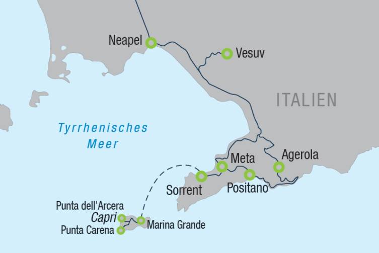 Im Morgenlicht fahren Sie nach Agerola - hier gehen Sie auf den „Sentiero degli Dei“ - auf der Wanderung durch die Berglandschaft genießen Sie fantastische Ausblicke auf die Küste von Praiano bis Capri - die Strecke führt hoch über dem Meer durch eine Felsregion und über geschwungene Terrassen und Treppen mit herrlicher Sicht auf die zerklüftete Küste hinunter ins mondäne Positano.