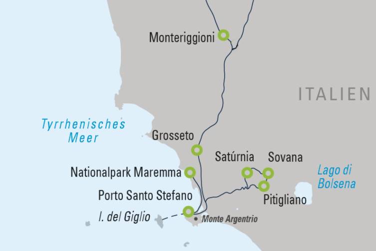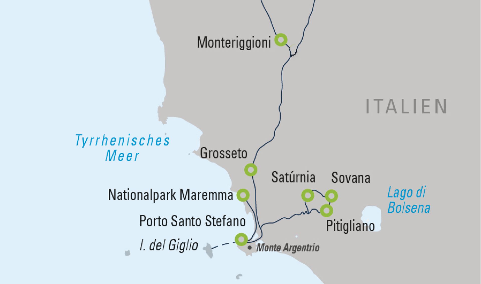 Wiesen und Felder, versteckte Schluchten und Flusstäler, Schafherden und stille Dörfer. Vom „Heiligen Berg“ der Etruskerinnen bis zu den warmen Quellen in Saturnia, von Pitigliano bis zur Insel Giglio - die Maremma wird Sie begeistern. Kein Wunder, dass die Südtoskana ein Wander- und Radfahrparadies ist, aber auch eines der schönsten Badeurlaubsziele Italiens.