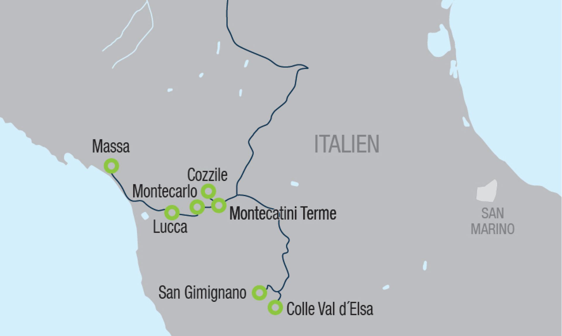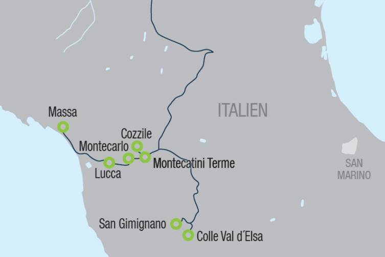 Die Wanderung führt Sie in eines der schönsten Weinanbaugebiete der nördlichen Toskana, in das Gebiet von Montecarlo: der Weg führt durch Mischwald leicht bergauf, vorbei an einer fünfhundertjährigen Stieleiche und am Dörfchen San Martino erreichen Sie den romantischen Ort Montecarlo - mittags erholen Sie sich in der Fattoria Il Poggio bei einer typischen Jause mit lokalen Weinen - nachmittags bummeln Sie durch die Gassen Luccas.
