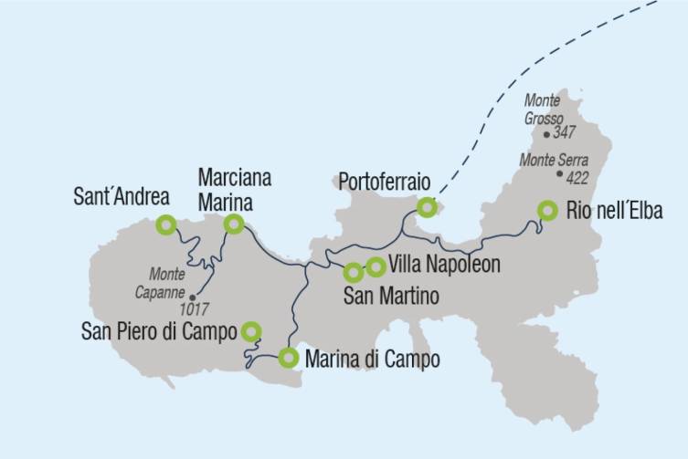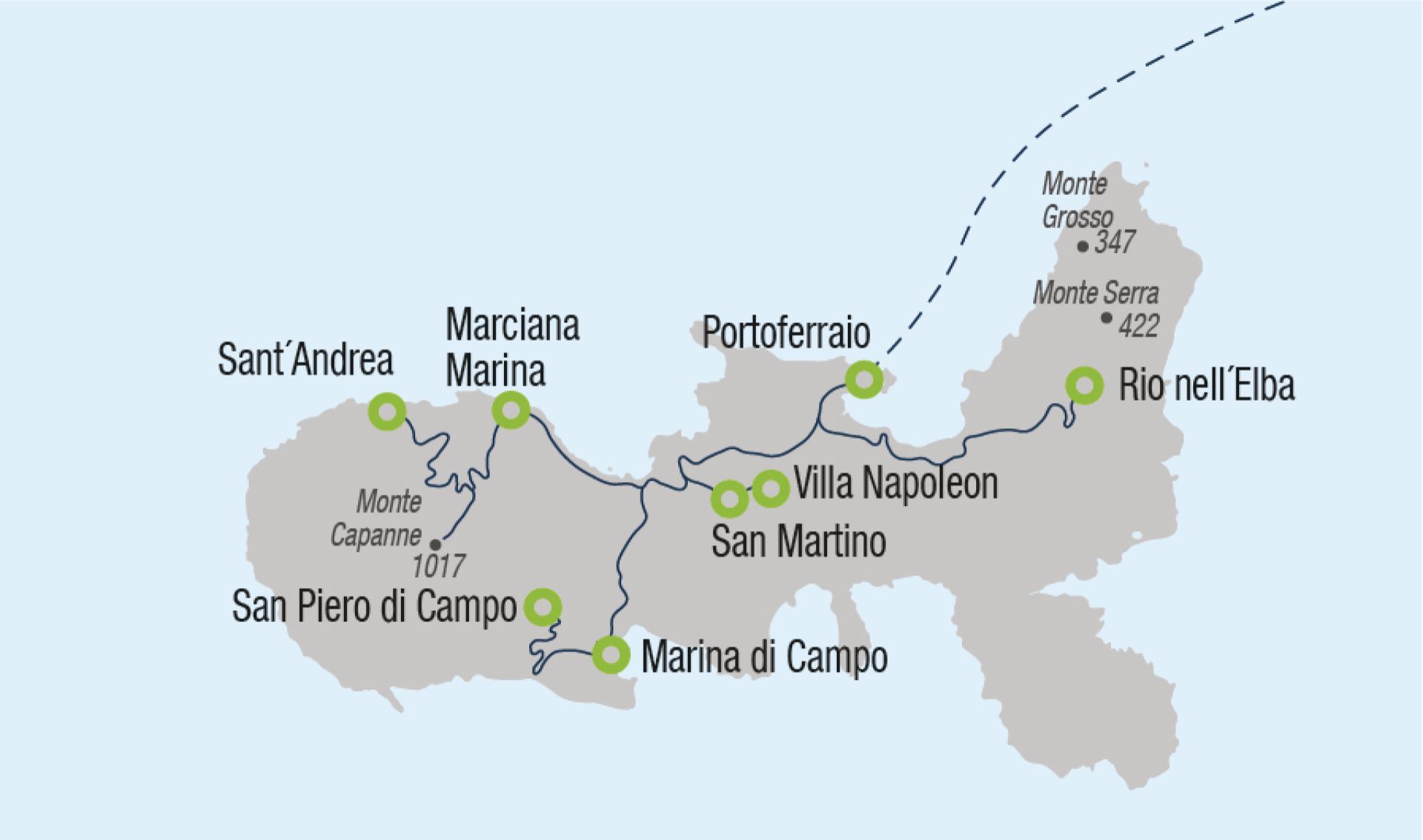 Anreise über Parma nach Piombino - einstündige Fährüberfahrt auf Elba - Abendessen in Ihrem Hotel in Portoferraio.