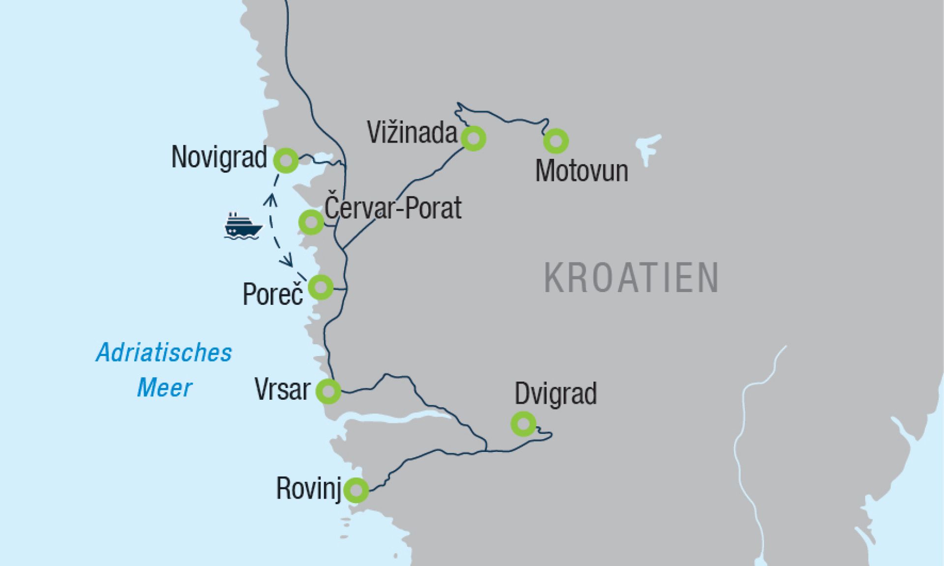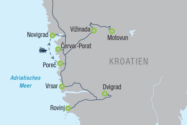 Ein herrlicher Tag am Wasser erwartet Sie: Entlang der malerischen Küste wandern Sie von Červar-Porat Richtung Poreč - anschließend brechen Sie zu einer entspannten Panoramaschifffahrt nach Novigrad auf - an Bord genießen Sie ein Mittagessen, während die istrische Küste langsam an Ihnen vorbeizieht - in Novigrad bleibt Zeit für einen Spaziergang durch die charmanten Gassen - Rückfahrt mit dem Schiff nach Poreč.