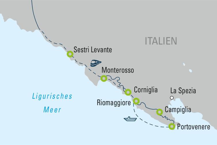 Mit der Bahn bis nach Riomaggiore: Wanderung über Campiglia nach Portovenere - per Schiff und Bahn gelangen Sie wieder nach Sestri Levante, wo Sie Ihr Abendessen mit herrlichem Blick auf das Meer genießen können.