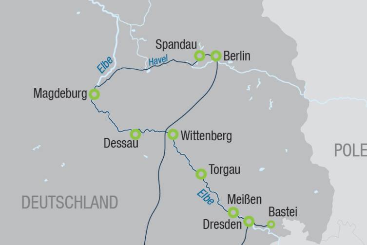 Von der lebendigen Metropole Berlin führt Ihre Reise über den Elbe-Havel-Kanal und das beeindruckende Wasserstraßenkreuz bei Magdeburg in die geschichtsträchtige Lutherstadt Wittenberg. Weiter geht es über das charmante Torgau und die Bauhausstadt Dessau zur traditionsreichen Porzellanmanufaktur Meißen, bevor das barocke Dresden den krönenden Abschluss bildet.