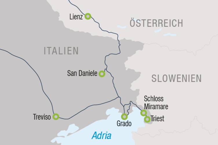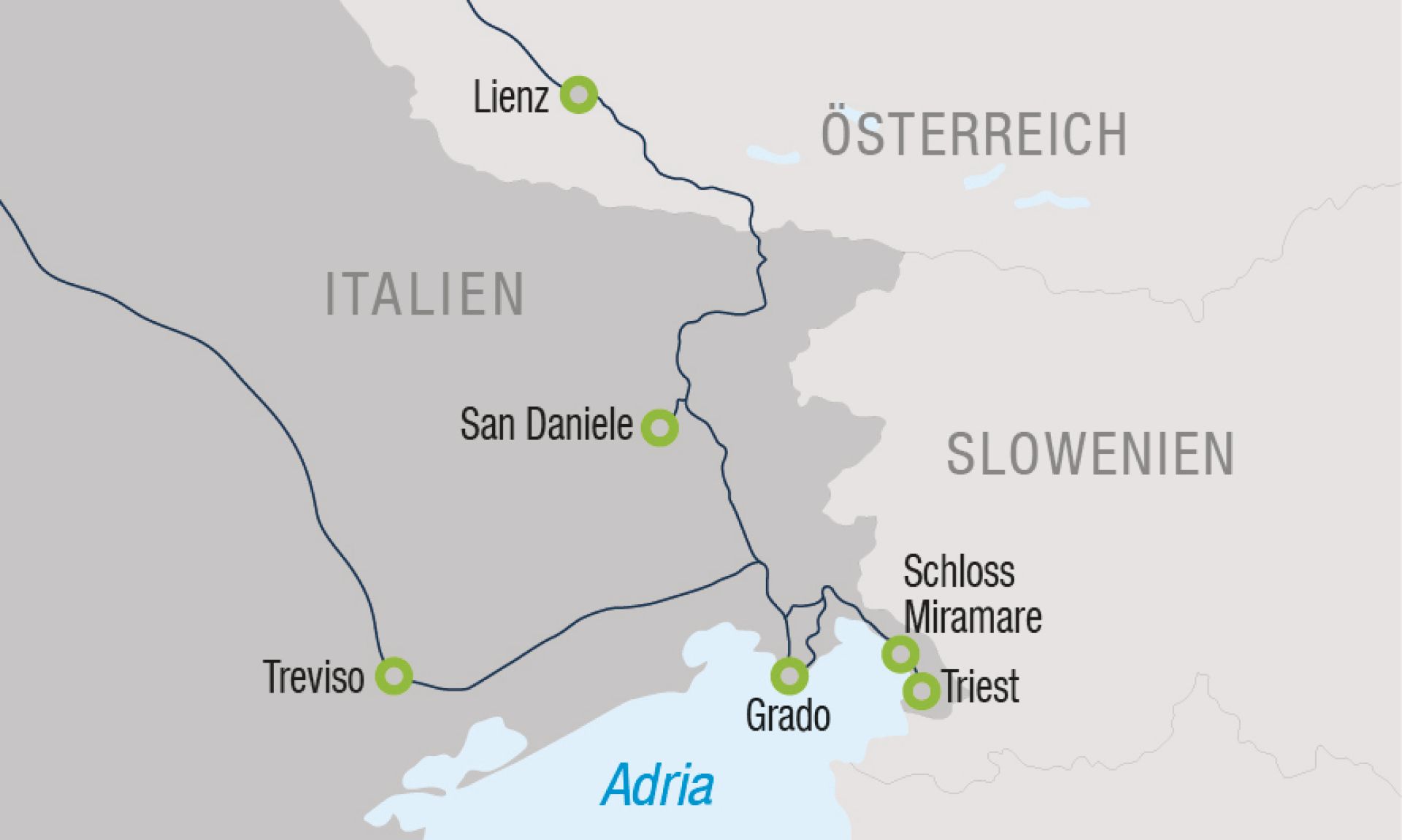 Entdecken Sie die zauberhafte Region Friaul: Freuen Sie sich auf Grado und Triest, die mit ihrem mediterranen Flair begeistern. Highlight: das majestätische Schloss Miramare. Genießen Sie eine Weinverkostung und probieren Sie den weltberühmten San Daniele Schinken - eine Reise voller Genuss und Kultur erwartet Sie!