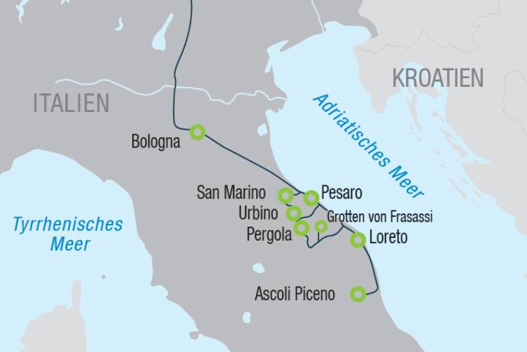 Anreise nach Bologna - genießen Sie das „Dolce Vita“ und die Schönheit der geschichtsträchtigen Altstadt mit ihren herrlichen Palästen - Weiterfahrt entlang der sanften Hügel nach Pesaro - Zimmerbezug in Ihrem Hotel am schönsten Strand von Pesaro, nur wenige Schritte vom malerischen Stadtkern entfernt - am Abend überzeugen Sie sich von der ausgezeichneten Küche Ihres Hotels bei einem ersten gemeinsamen Abendessen.