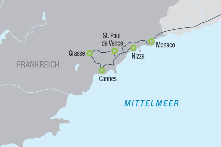 Die Côte d'Azur ist der Inbegriff für Sonne, Meer und Prachtstraßen. Neben mondänen Orten der High Society mit ihren Yachthäfen bietet die französische Riviera atemberaubende Landschaften. Lassen Sie sich vom azurblauen Meer und der goldgelb scheinenden Sonne bezaubern und genießen Sie die kulinarischen Besonderheiten dieser Region.