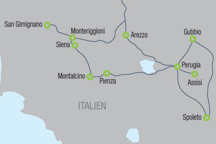 Sie fahren durch eines der schönsten Gebiete der Toskana nach Montalcino (Heimat des Brunello Weins) - Tipp: bestaunen Sie den herrlichen Ausblick von der imposanten Festung auf die weitläufigen Weinbaugebiete - durch das Val d´Orcia geht es in die UNESCO-Weltkulturerbe-Stätte Pienza, bekannt für Renaissance-Architektur und den Pecorino-Käse, den Sie bei einer Verkostung probieren - anschließend Weiterfahrt nach Perugia, Zimmerbezug und Abend zur freien Verfügung.