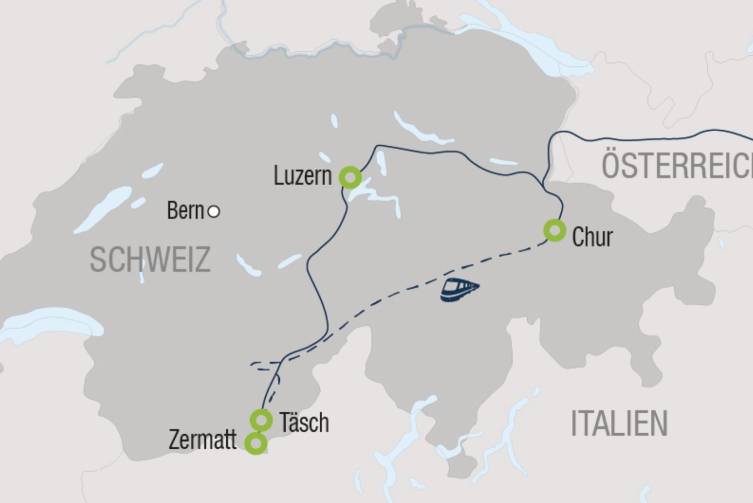 Anreise über Feldkirch nach Luzern (Aufenthalt) - über den Brünig - und den spektakulären Grimselpass durch eine wilde, karge Gebirgslandschaft, in welcher neben Granitgestein, Stauseen und Kraftwerksanlagen das Bild prägen (alternativ bei Schlechtwetter: Zürich - Bern mit Mittagspause - Genfer See - Montreux - Sion) nach Täsch - im Pendelzug nach Zermatt - Abendessen im Hotel.
