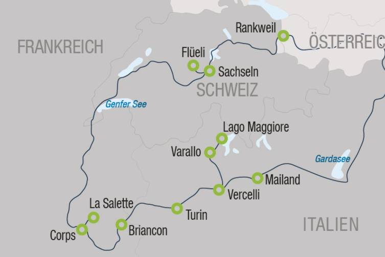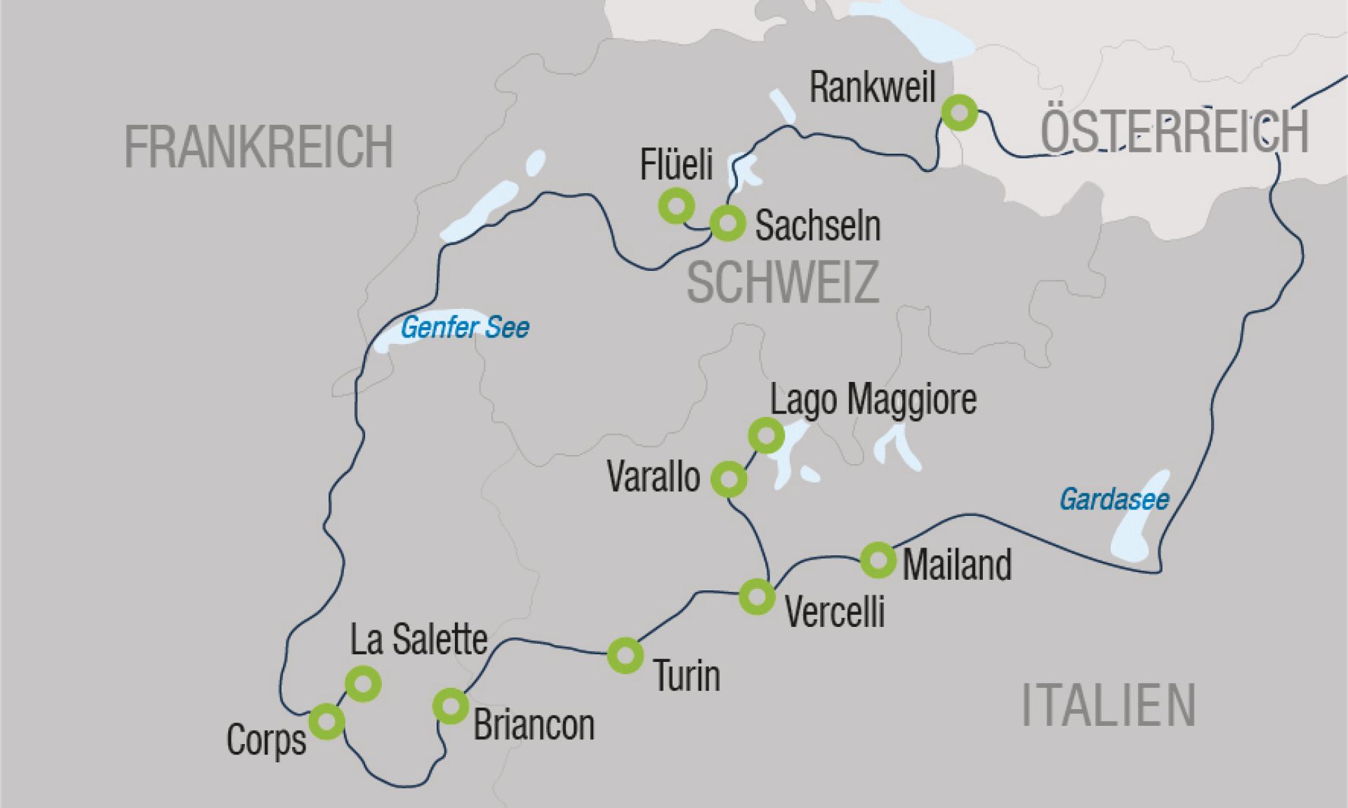 Fahrt über den Brünigpass nach Interlaken mit herrlichem Blick auf Eiger, Mönch und Jungfrau - vorbei an Bern, Vevey und Lausanne, durch das Weinbaugebiet entlang des Genfersees weiter nach Frankreich - über Grenoble führt die Reise nach Corps - Auffahrt zum 1.770 m hohen, inmitten einer traumhaften Natur gelegenen, Wallfahrtsort Notre Dame de La Salette - Sie übernachten direkt in der Klosteranlage, ein Ort der Stille und Meditation - ein tiefgreifendes Erlebnis.