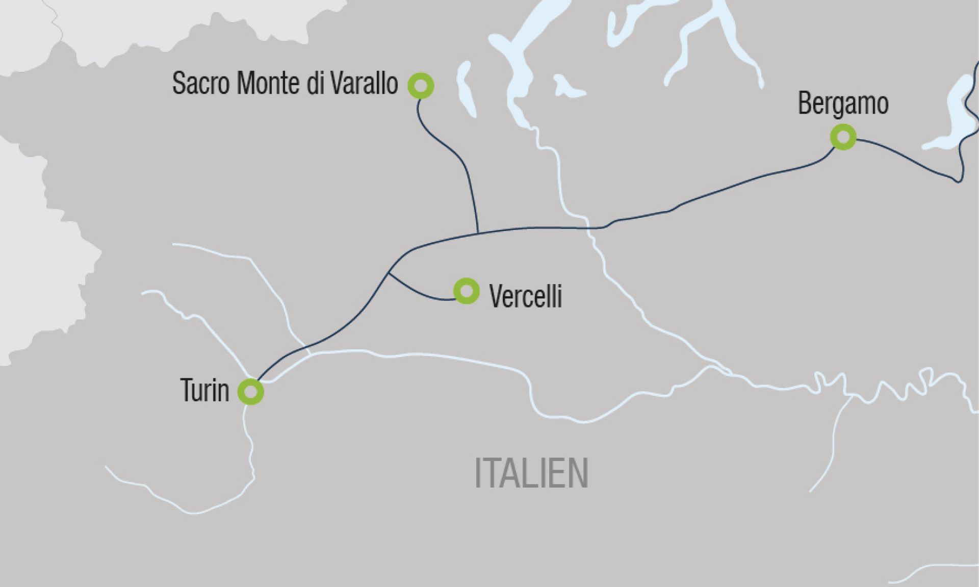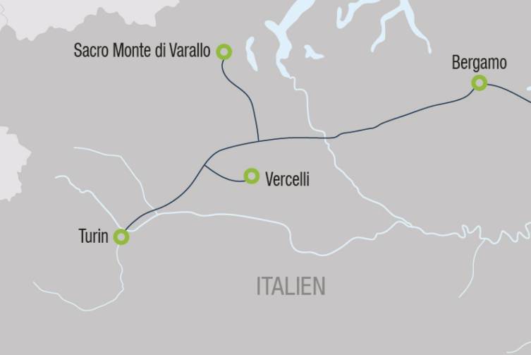 Nach dem Frühstück Fahrt zum Sacro Monte di Varallo - der älteste der neun „Heiligen Berge“ des Piemont vereint Natur, Kunst und Glaube auf eindrucksvolle Weise - Auffahrt mit der Seilbahn und Besichtigung der Kirche Santa Maria delle Grazie - im Inneren beeindruckt die "parete Gaudenziana", ein großes Freskoensemble von Gaudenzio Ferrari aus dem Jahr 1513, das 21 biblische Szenen von der Verkündigung bis zur Auferstehung zeigt - im Anschluss Weiterfahrt nach Bergamo - Sie lernen die charmante Stadt bei einer Rundfahrt mit dem Tuk-Tuk-Train näher kennen - im Anschluss Besichtigung des Glockenturms, bekannt als Campanone - der Tag wird abgerundet mit einer Andacht in der Basilika Santa Maria Maggiore - Rückfahrt mit der Seilbahn in die Unterstadt - Abendessen im Hotel.