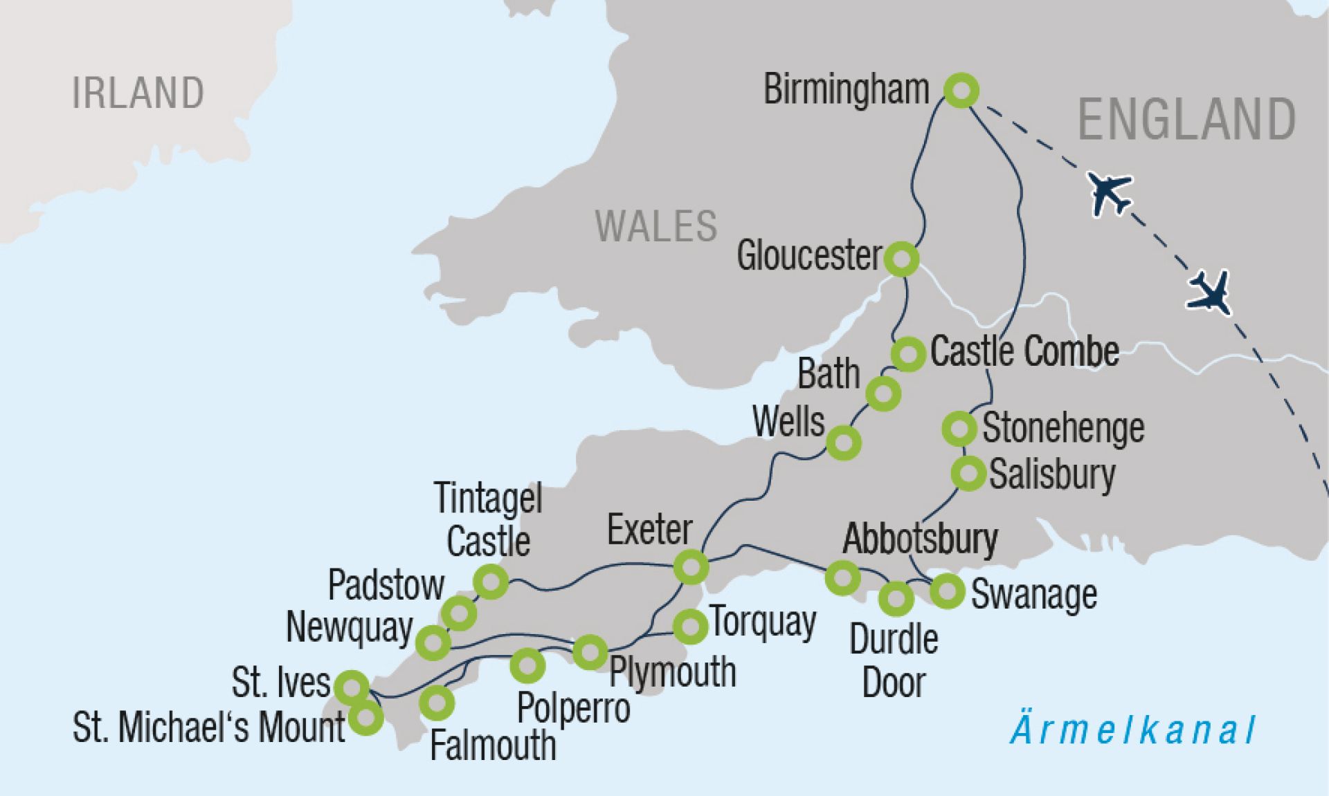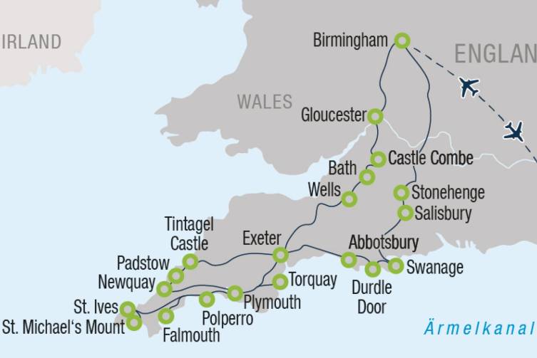 Anreise nach Birmingham - erste Eindrücke gewinnen Sie in Gloucester, bekannt für seine beeindruckende Kathedrale und die belebten Docks - Weiterfahrt ins Bilderbuchdorf Castle Combe, oft Drehort historischer Filme - später erreichen Sie die UNESCO-Welterbestadt Bath, wo Sie bei einer Stadterkundung mit Ihrer Reiseleitung u.a. The Circus, den prächtigen Royal Crescent, die elegante Pulteney bridge und die imposante Kathedrale entdecken.