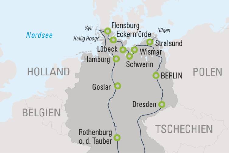 Gemeinsam mit Helmut Hofer entdecken Sie auf dieser Reise die Unterschiede zwischen Nord- und Ostsee. Dresden, Berlin und Stralsund mit seinen Backsteinbauten erwarten Sie. Auf den Inseln Rügen und Sylt entspannen Sie in Strandkörben, auf der Hallig Hooge tauchen Sie ein in das Leben der Nordfriesen und als krönenden Abschluss lernen Sie auch noch die Hansestadt Hamburg kennen.