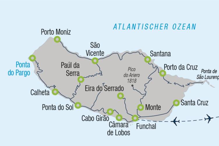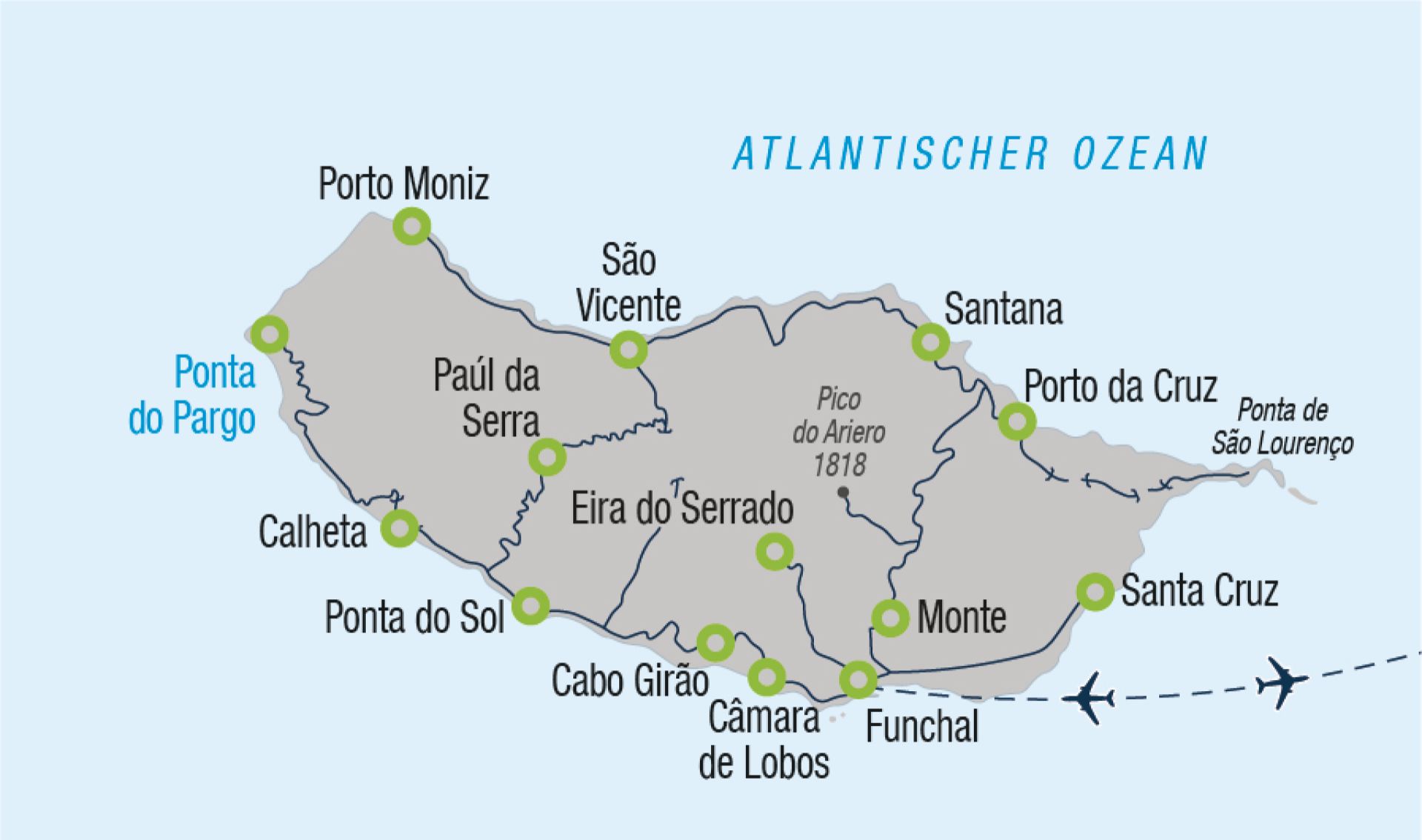 Im zentralen Bergmassiv von Madeira ist Ihr erster Stopp der Aussichtspunkt Pico do Arieiro - Weiterreise in den Naturpark Ribeiro Frio, bekannt für seine Forellenzucht - nach einer Besichtigung und Mittagspause in Santana gelangen Sie in das charmante Dorf Porto da Cruz - auf dem Rückweg Fotostopp bei der südöstlichen Landzunge Ponta de Sao Lourenco, wo Sie eine fantastische Panoramasicht auf den Atlantik und die spektakulären vulkanischen Gesteinsformationen genießen - Rückfahrt nach Funchal.