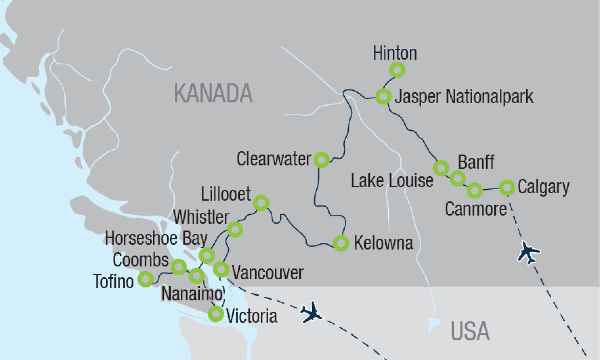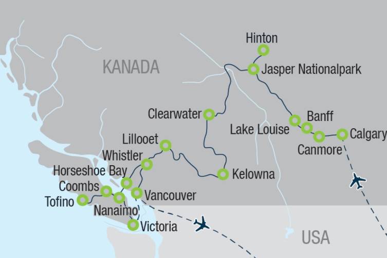 Entlang des spektakulären Sea-to-Sky Highways, vorbei an den beeindruckenden Brandywine Falls mit 70 Metern Höhe und den mächtigen Shannon Falls erreichen Sie Horseshoe Bay - von dort gelangen Sie per Fähre nach Vancouver Island - über Nanaimo und den Pacific Rim Highway erreichen Sie den bekannten Küstenort Tofino - am Rail Forest Trail erleben Sie bei einem leichten Rundwanderweg die mächtigen moosbewachsenen Bäume des Regenwaldes.