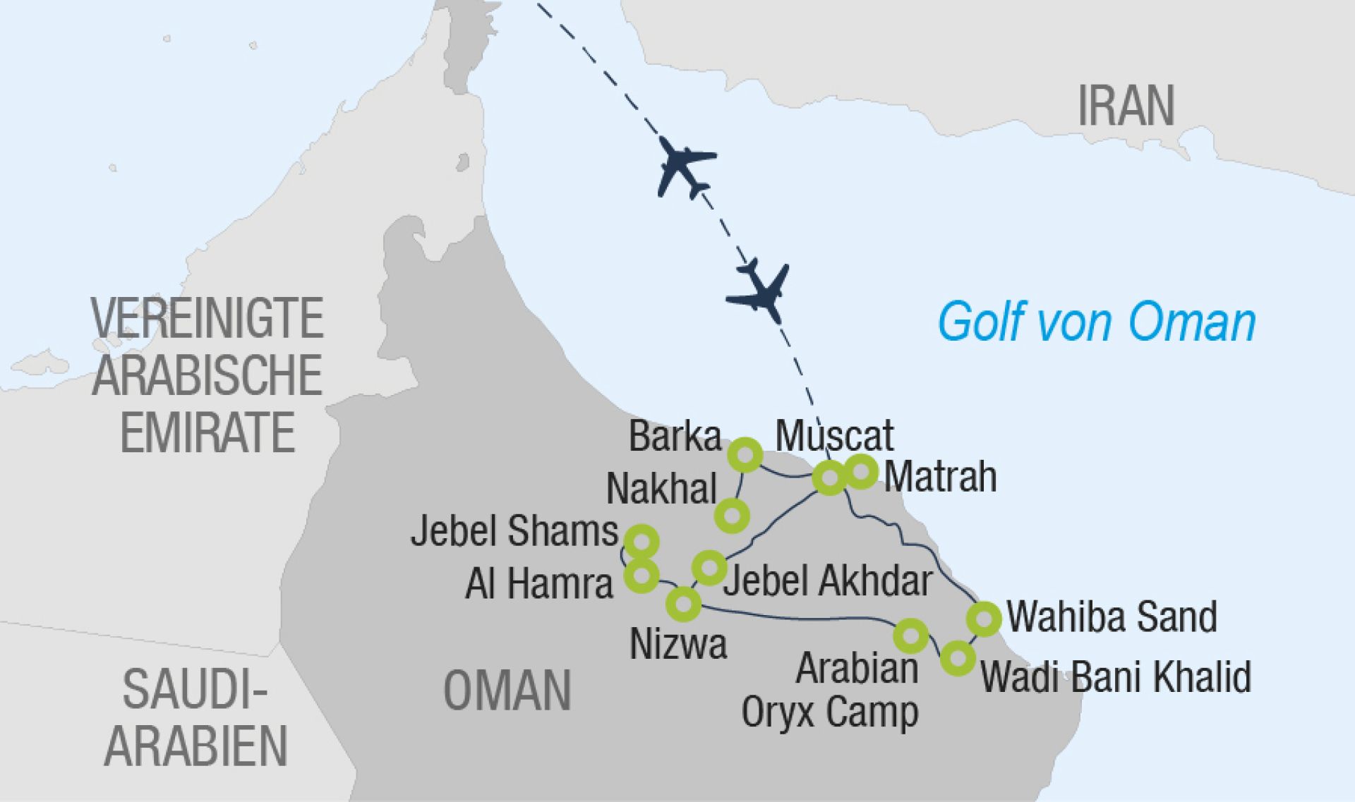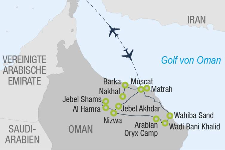 Prachtvolle Paläste, wehrhafte Forts, Moscheen und geschäftige Souks, wo der Duft von Weihrauch und Myrrhe in der Luft liegt - im Oman tauchen Sie ein in ein Märchenland aus 1001 Nacht - auch die landschaftlichen Schönheiten des im Südosten der arabischen Halbinsel gelegenen Sultanats ziehen Besucherinnen in ihren Bann.