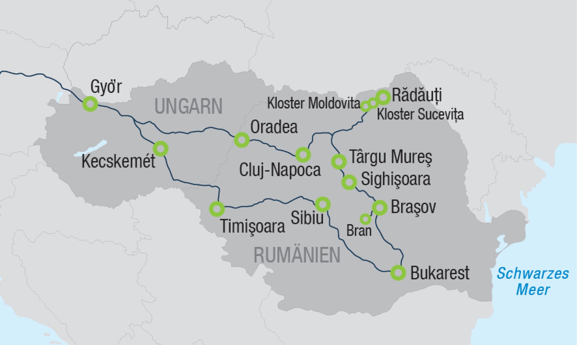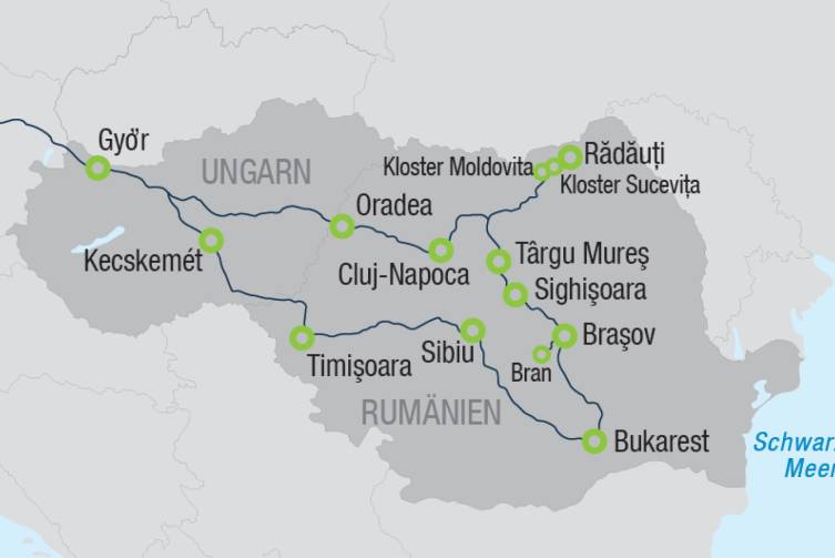 Entdecken Sie Rumänien von seiner eindrucksvollen Seite: Eine Reise voller kultureller Kontraste, geschichtsträchtiger Städte, faszinierender Klöster und herzlicher Gastfreundschaft. Sie erleben ursprüngliche Dörfer, berühmte Burgen, lebendige Städte und das grüne Herz der Karpaten.