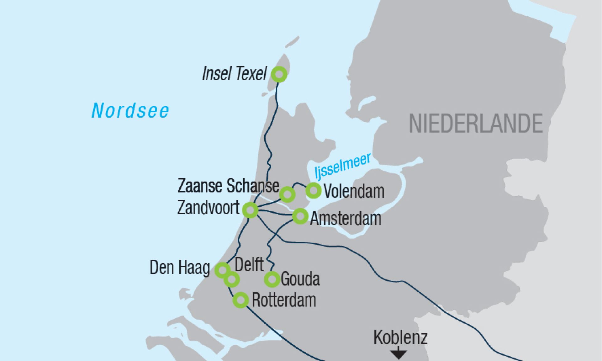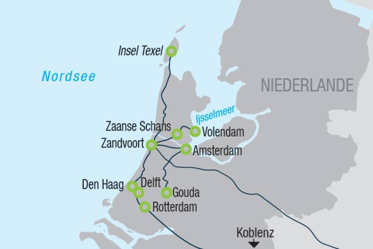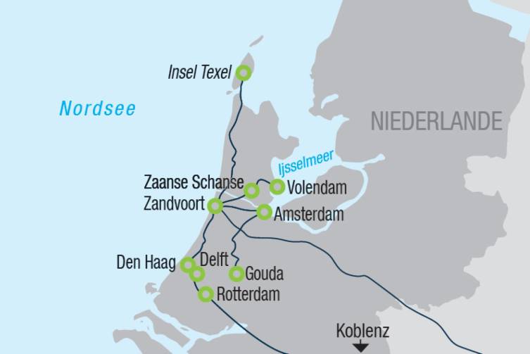 Besichtigung von Zaanse Schans, einem Freilichtmuseum, in welchem eindrucksvoll das ländliche Leben der Holländer im 19./20. Jahrhundert mit typischen Bauten wie Mühlen, Läden und Wohnhäusern nachgestellt wird - anschließend geht es weiter nach Volendam, berühmt für die traditionelle Tracht - Bootsfahrt in das Fischerdorf Marken, einem kleinen, idyllischen Inseldorf - Bustransfer zurück ins Hotel.