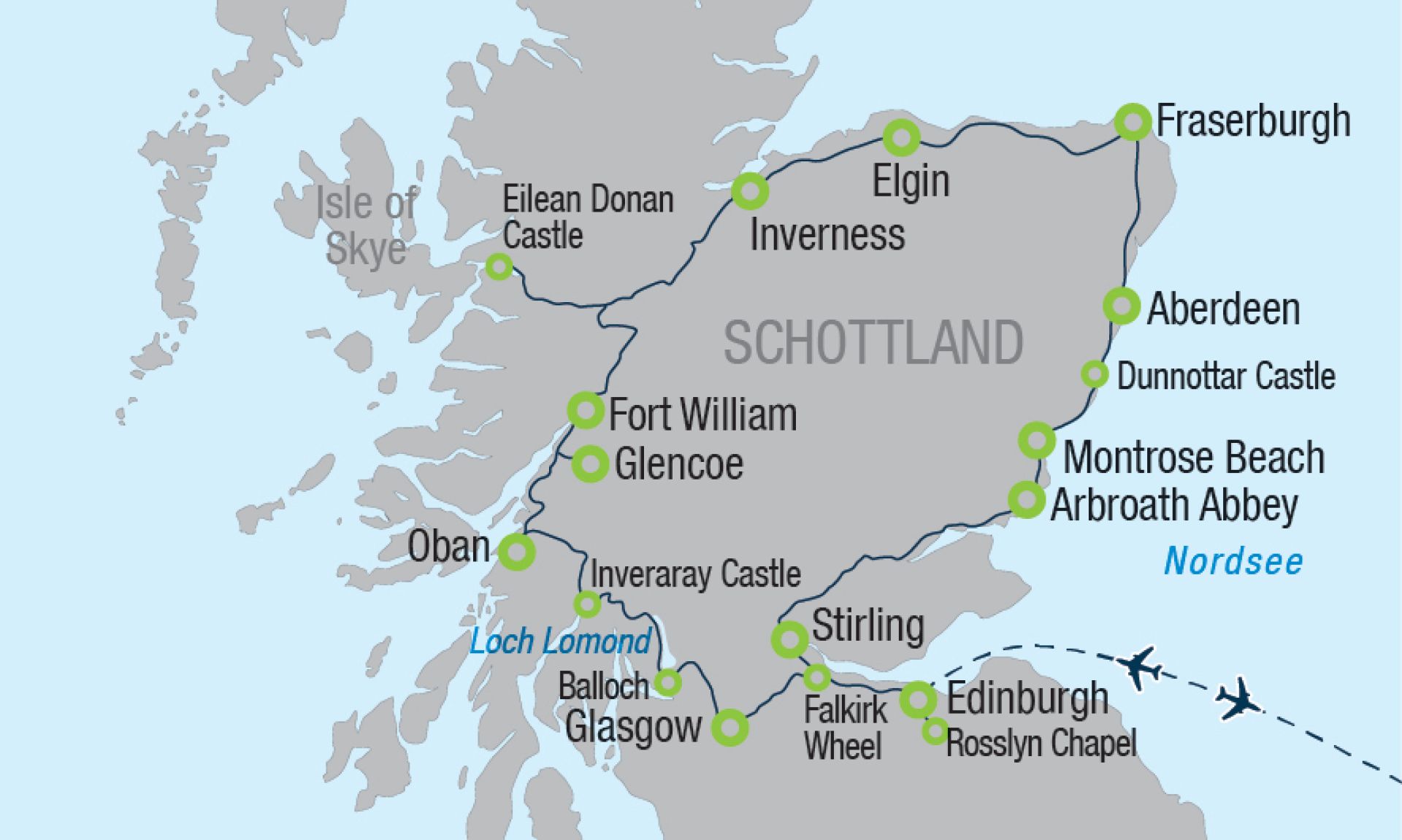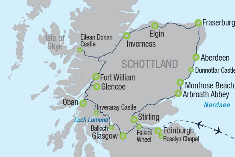 Nach dem Frühstück geht es zum Schlachtfeld von Bannockburn - in Arbroath Abbey, einst Zentrum der schottischen Unabhängigkeit, wird Geschichte lebendig - die Route führt weiter über Montrose Beach zur spektakulär auf den Klippen thronenden Ruine von Dunnottar Castle - über das hübsche Küstenstädtchen Stonehaven erreichen Sie schließlich die Universitätsstadt Aberdeen - bei einer Stadtbesichtigung mit Ihrer Reiseleitung lernen Sie die charmante „Granite City“ mit ihrer unverwechselbaren Architektur kennen.