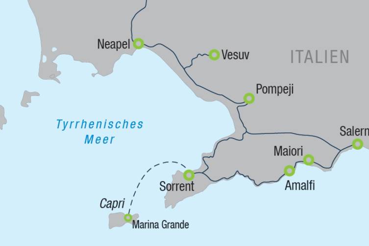 Über Positano fahren Sie entlang der Amalfitana, der „schönsten Straße der Welt“, nach Amalfi - Zeit zur freien Verfügung - kurze Schifffahrt nach Maiori, um die Küste von einer anderen Perspektive zu erleben - Weiterfahrt bis ans Ende der Amalfitana, unzählige Panoramapunkte laden zum Verweilen und Fotografieren ein - Rückfahrt ins Hotel.