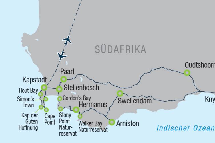 Nach dem Frühstück geht es entlang der Küstenstraße via Clifton und Camps Bay nach Hout Bay und über den atemberaubenden Chapmans Peak Drive - hier genießen Sie die Aussicht auf Hout Bay und den Atlantischen Ozean - weiter geht es zum Highlight des Tages, dem „Kap der Guten Hoffnung“ und Cape Point - die Rückfahrt erfolgt über Simons Town, der den größten Marinestützpunkt Südafrikas bildet.