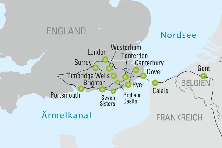 Lernen Sie bei einer Stadtführung die wichtigsten Sehenswürdigkeiten der lebendigen Stadt Gent kennen - anschließend Fahrt nach Calais und Fährüberfahrt nach Dover - Übernachtung und gemütliches Abendessen in Ihrem Hotel.