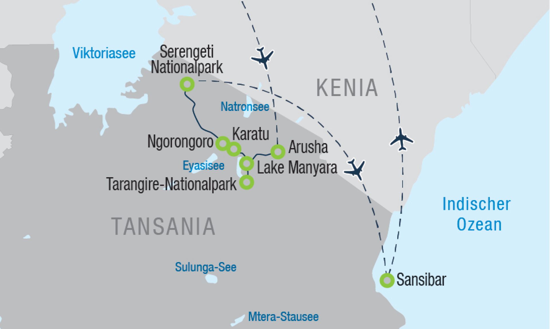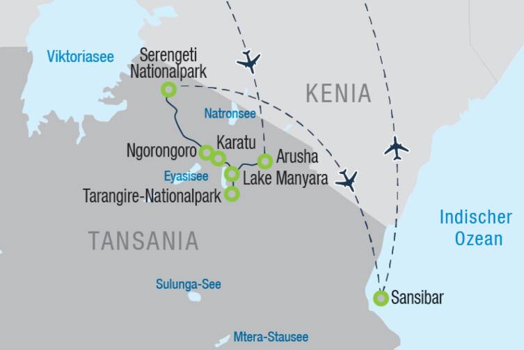 Am Vormittag fliegen Sie mit einem kleinen Fluggerät direkt aus der Serengeti auf die wunderschöne Insel Sansibar - Transfer zum Hotel - Zimmerbezug und Abendessen in Ihrem Hotel an der Ostküste der Insel. (F/M/A)